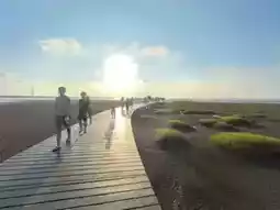 Start at the entrance of Gaomei Wetland and walk along the long wooden boardwalk that leads into the wetland. You can stop anytime along the way to take photos, especially during sunset when the ground reflects the blue sky, white clouds, and the golden hues of the setting sun—it's truly stunning. After finishing the boardwalk, head to the nearby Gaomei Windmill Avenue, located at Huan Gang North Road in Qingshui District, Taichung City. Capture the iconic large wind turbines alongside the natural wetland backdrop for a unique Taichung vibe.