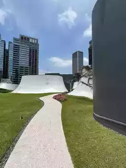 My love for this rooftop is simple: **Architecture isn't just for viewing; it invites you to walk, sit, and breathe. **The white hills shield the city noise from view below, leaving the garden with only the sound of the wind, the distant hammering of construction, and the occasional laughter of children running.