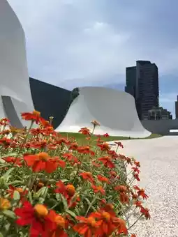 Walking up the National Taichung Opera House's Sky Garden feels like stepping into a park suspended mid-city—white undulations resemble rolling hills, flowers and winding paths tucked away at your feet, and the clear, luminous Taichung sky above your head.
