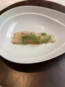 The fish dish on the white porcelain plate in the photo was the highlight of my meal. The fish, preserved at a low temperature, retains its translucence, then is drizzled with refreshing oil and herbs. The first sip is the sweetness of the seawater, followed by the oil spreading across the tongue, leaving a clean finish. My description for this dish is: quietly delicious.