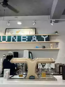 I arrived at the shop in the evening. Upon entering, the first thing I saw was the white wall with the words "Mountain: Hoji" and the red slogan "FROM THE MOUNTAIN TO THE SUN." Inside, a small alcove with wooden latticework and blue seating is perfect for waiting for drinks or taking a short break. In the center of the bar sits their tea-brewing equipment, two metal arms seemingly conducting an experiment. A wooden flavor board on the wall meticulously lists each tea's roast degree, flavor description, and signature combinations—you don't even need to ask the staff for recommendations; just walk up to the board and you'll find the answer.