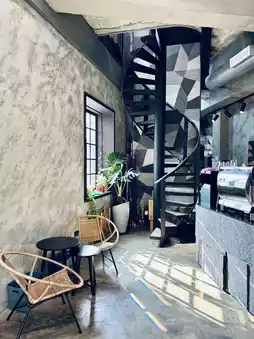 Le Room creates a tranquil atmosphere with its understated gray bricks, cement, and wooden lattice windows🪟. The three-story space, from the spacious lobby on the first floor to the graceful spiral staircase, exudes sophistication and order in every detail.