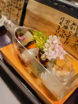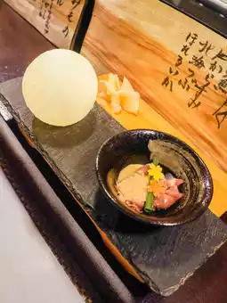 The next dish is a set of three small bowl dishes that look like an art installation. I like the miso squid the most. The rich miso is full of fermented flavor and goes well with the soft squid. There is also smoked whale, which has a richer flavor after smoking than sashimi. The crisp jellyfish and sour sauce bring a refreshing ending to the first two dishes, and are also very appetizing.