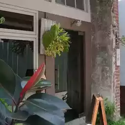 Red bricks and green plants in front of the door with a sign