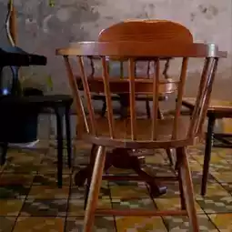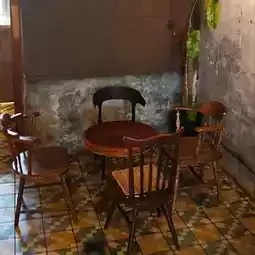 Floral floor tiles with old wooden tables and chairs