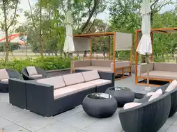 ✨Rattan chairs, terrazzo, geometric tiles and modern design in the new retro style lobby