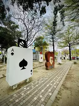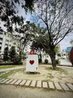Wuqiao Park, hidden in the center of Tainan City, is a parent-child park full of childlike fun and fantasy. When you enter the park, the first thing that catches your eye is the huge orange cat slide. The laughter of children sliding down the cat's back makes the whole park full of vitality and joy. What is even more surprising is that the installation art with the theme of "Alice in Wonderland", including the Queen of Hearts, playing card soldiers and other landscapes, makes people feel as if they have stepped into a fairy tale world. While taking photos and checking in, they are still full of childlike innocence. The swings, see-saw and sand pit here make the children have a lot of fun.