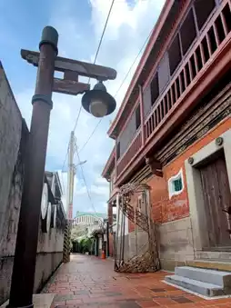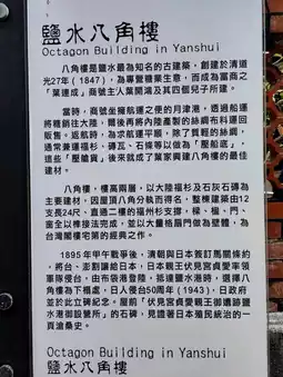 This wooden octagonal building built in 1847 is very rare among Taiwan's historic buildings. This large mansion was built by Ye Kaihong, a wealthy businessman engaged in the sugar trade at the time, and his sons. There is an acrylic plate on the outer wall of the Octagonal Building, which records the historical background of the Octagonal Building. As you enter the gate, you will see a large stone tablet in front of you. This is a monument erected by the Japanese government on the 50th anniversary of its occupation of Taiwan (1943). The tablet is engraved with the words "The Remains of Prince Fushimi Sadanae and the Imperial Camp at Yanshui Port." I took a quick look at the outside of the building and it looked like there were still people living there. There were also introductions online saying that you can go inside to take pictures. When I was about to step in, a foreign worker suddenly ran over and said that this was my grandfather's home and that I couldn't go in during the epidemic. In the end, I could only take a few photos inside with my phone, and a few more photos in the yard before leaving and heading to the alley behind the octagonal building to continue exploring the history of Yanshui. (20210813)