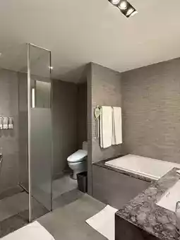 The rooms are spacious, and the bathroom includes both a shower and a bathtub for soaking. Bath salts are also provided next to the bathtub for added relaxation.
