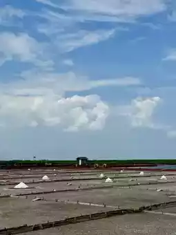 At the Jingzijiao Tile-Paved Salt Fields, the setting sun casts a shimmering light across the salt pans, creating a crystalline carpet spread across the earth. These are Taiwan's oldest tile-paved salt pans, their grid-like salt ponds neatly arranged, reflecting the light of the sky and the shadows of the clouds, creating a poetic and majestic scene. Watching the salt workers carefully push the crystals with wooden rakes, time seems to slow down.