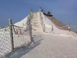 • The scenery is special: The huge white peaks of salt contrast sharply against the blue sky, coastal landscape, and wetlands. From the top of the larger mound (about six stories tall), you get panoramic views over former salt fields, lagoons, and the coastal flats.