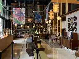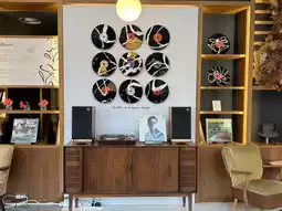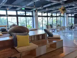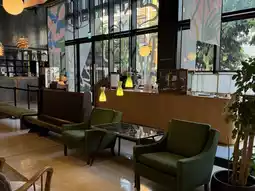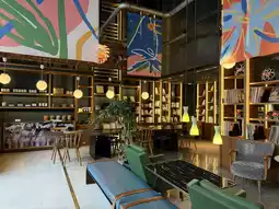 The lobby on the first floor has a high ceiling and a stylish design. There's a café where you can grab a coffee, relax, or browse the bookshelves. The hotel's exterior is also very stylish, making it beautiful for photos both day and night. Across from the hotel is the Yu-Ai Market, which offers breakfast, coffee, and a traditional market in the morning, and is also a great place for dinner or late-night snacks.