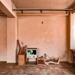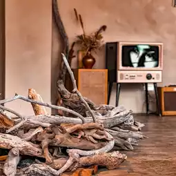 A pile of dead branches and driftwood on the ground is the focus of a room🪵