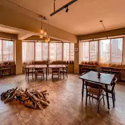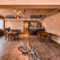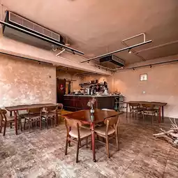 Desert-like wall color paired with dark wooden tables and chairs🪑