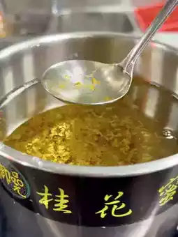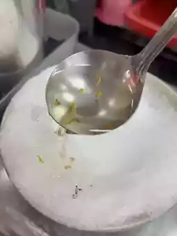 The stall’s offerings include two main styles of tangyuan: the classic hot soup version and the cold shaved ice version, which is their signature dish. The cold version stands out, with finely shaved ice topped with freshly cooked tangyuan. The contrast of the cold ice and the hot dumplings creates an unexpected, refreshing experience. To enhance the flavors, customers can drizzle a homemade osmanthus syrup and a hint of lemon over the dish, adjusting the amounts to suit their personal taste.