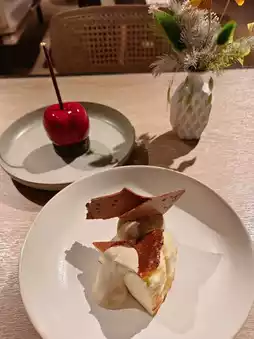 Today we have pistachio cherry mousse, and you can also order a Basque dish, both are delicious!