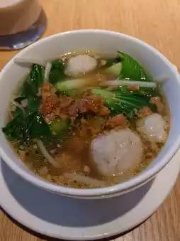 A bowl of meatball and vegetable soup in the freshly cooked area, paired with freshly roasted vegetable sesame cakes and sesame cake fried dough sticks, is so satisfying!