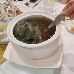 The chicken soup is a whole black-bone chicken. It is not very dry.