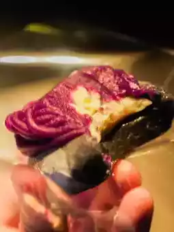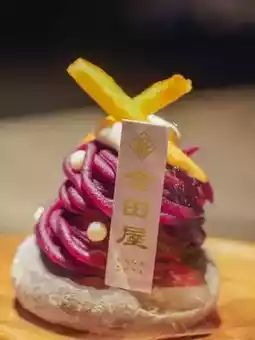 There are two crispy sweet potato strips on the top layer, and pearl-shaped sugar beads are used as decoration on the purple sweet potato puree. When eating, take off the upper layer first. The delicate and silky purple sweet potato puree is very rich. Then eat the chewy and soft outer layer of the Daifuku, which is made of black glutinous rice skin with bamboo charcoal added.