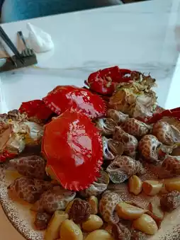Fresh, all kinds of fresh cold cuts, appetizers and salads with white wine. Today's red crabs are big and sweet.