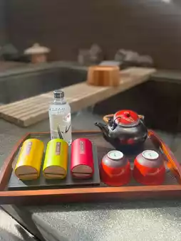 Recommend the "Luxi Classic Set" (NT$1200/2 people)! The savory dishes include "Truffle Chicken Roll" and "Mentaiko Baguette", and the desserts are "Hot Spring Pudding" and "Red Bean Yokan"~ Sitting on the terrace of the teahouse, watching the stream passing through the stone bridge, the baby poking the pudding with a small fork is super healing~