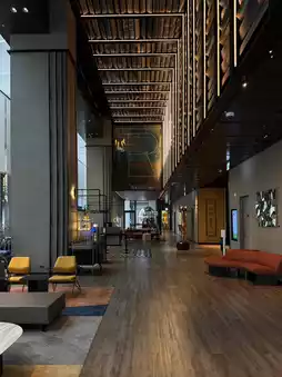 • "Low-key yet elegant" exterior design! The building features exposed concrete and wooden slats, resembling a tranquil oasis in the city by day and a warm, homey retreat by night.