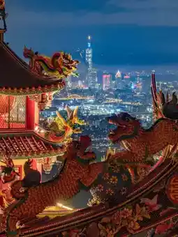 ❶Through the embedded porcelain of Kaizhang Shengwang Temple, you can photograph Taipei 101 and Taipei's night view, with ancient and modern elements in the same frame.