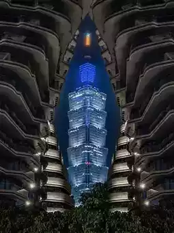 Taipei 101 nestled between Taipei's luxury residences, with the building on the left being a reflection.