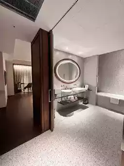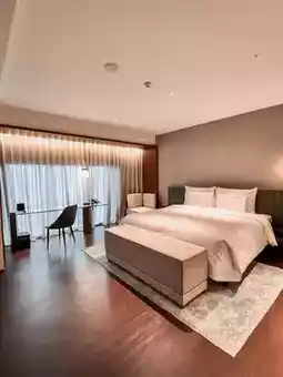 Once you enter the room, you are attracted by the large floor-to-ceiling windows, natural light sprinkled throughout the space, with warm wooden tone decoration, instantly relax ~ The bathroom adopts dry and wet separation design, marble countertops with matte glass, full of luxury! The most surprising thing is the free drinking at the in-room minibar and a capsule coffee machine