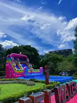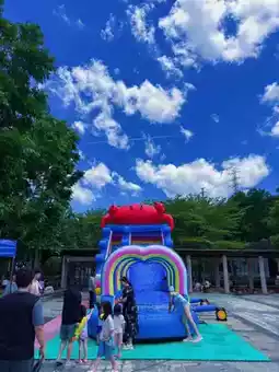 The park's grass stands on the eye-catching pink rainbow water slide. The dreamy shape is matched with the pool. It is cool and photogenic. It is perfect for bringing children to release their energy!