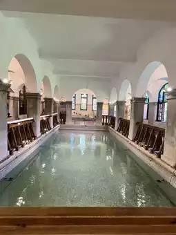 Originally from the historic public bathhouse in 1913, the white archway and the morning light complement each other.