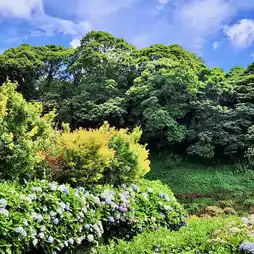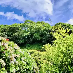 Continuing towards Bamboo Lake, the path is shaded by trees and runs alongside irrigation canals, passing by hydrangea fields. Although the flower season is nearing its end, the gentle breeze still showcases their final beauty. This leisurely and relaxing hiking route is perfect for escaping the summer heat!