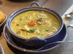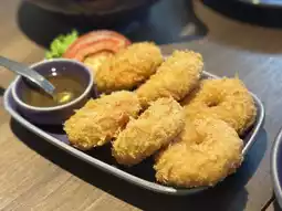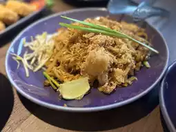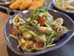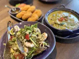 The interior decor is stylish and perfect for gatherings with friends or family. This time, the three of us ordered five dishes: seafood salad, golden shrimp cakes, green curry chicken, stir-fried cabbage with shrimp paste, and Thai-style rice noodles. Additionally, we received a complimentary dessert, "Momo Cha Cha," for the birthday celebrant of the month. The overall selection was diverse, the portions were just right, and we left feeling quite full.