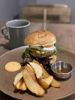 I highly recommend the "Sea Salt Caramel Beef Burger" for NTD360 and an Americano for NTD120, with no service charge. I initially thought the sea salt caramel would be applied to the beef patty and sandwiched between the burgers, but it actually came in a small, accompanying bowl. The burger was quite thick, and the rice bun was quite chewy. Besides the lettuce, there was a layer of hamburger patty, a thick layer of ham, melted cheese slices, and a soft-boiled egg. Be careful when picking it up, as the egg liquid doesn't drip. To avoid it from spilling everywhere, I ended up eating it with a knife and fork. I cut the burger patty and dipped it in the sea salt caramel sauce. The salty-sweet combination was a perfect balance, a bit like toffee with a burger, but not overly sweet. The subtle caramel aroma gave the taste buds a unique impact. The accompanying fries were also delicious, freshly fried, crispy on the outside and soft on the inside. Even without the dipping sauce, they were incredibly filling.