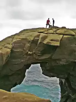 หินก่อตัวเป็นโค้งคล้ายงวงช้าง ยื่นออกไปเหนือทะเล (rock-arch) บนหน้าผาสูงเหนือชายฝั่ง
