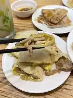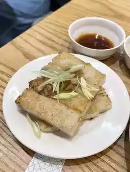 The turnip cakes, made from fried radish, are also delicious. We also ordered another dish, a wrapper made from egg and pork, filled with Taiwanese-style kimchi. It was also delicious. We ordered soy milk, which was okay, though the bean flavor was a bit strong. The shop claims that the soy milk is non-GMO.