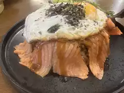 A hearty rice bowl served with egg and salmon, packed with savory goodness.