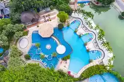 Whether it's a daytime aerial view of the well-arranged pools and lush greenery forming a refreshing picture, or nighttime shots of the hotel illuminated by lights alongside the glowing tower in the distance, you can capture breathtaking panoramic photos that add a unique perspective to your travel photography.