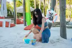 The hotel's outdoor beach area features sunshine, sand, and colorful water toys that create a playful scene. Grab some beach toys, squat on the sand, and capture moments of focused play. Alternatively, stand beside a green kayak, letting your hair flow in the wind for vibrant and dynamic photos. In the pool, lie on a brightly colored paddleboard and take overhead shots with the blue water as the backdrop for fresh and eye-catching images.