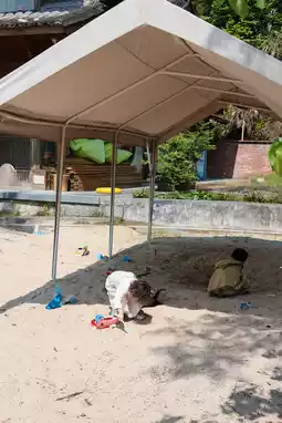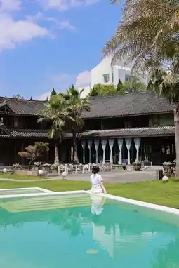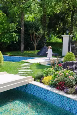 In front of the homestay, there is a super large swimming pool, palm trees 🌴, and a fish pond.