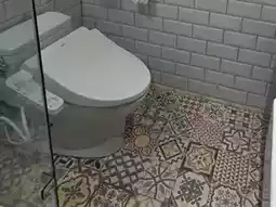 The floor tiles in the hotel's wash area are very cute. The white, clean, and refreshing bath area is complemented by these stylish tiles.