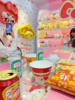 The 7-Eleven store in Taiwan, located in the Ximending area, is uniquely decorated with a pink Hello Kitty theme. Everything from the entrance sign, doors, ceiling, tables, and counters is covered in the theme.
