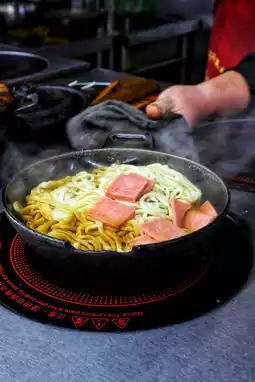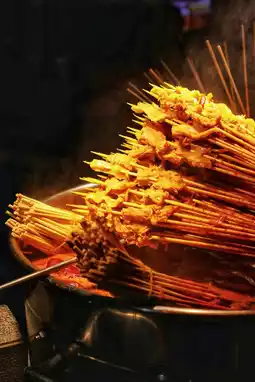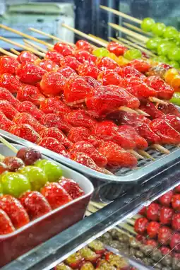 Roasted lamb, beef, candied haws, pears, strawberries, and steaming dumplings and buns...