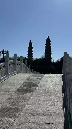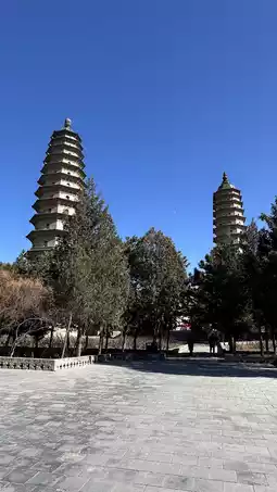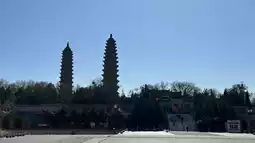The twin pagodas are both octagonal and 13 stories high, with a brick and stone structure, standing at 54.7 meters tall. They are the most complete, largest, and tallest twin pagodas in China. The two pagodas are 60 meters apart, with a harmonious style but unique characteristics: the southeast pagoda is made of plain bricks, with simple carvings and a slender body, giving it a majestic and beautiful appearance. The northwest pagoda has glazed tiles, with intricate and luxurious carvings, and a slender body, giving it a graceful and elegant appearance. The twin pagodas are a masterpiece of construction, with no nails or wood used in their construction, entirely made of bricks and stones, representing the epitome of Ming Dynasty beamless brick structures.