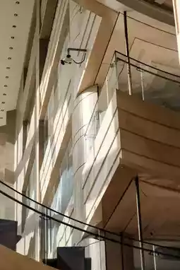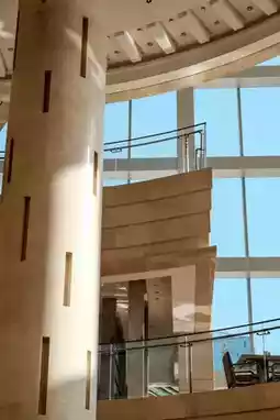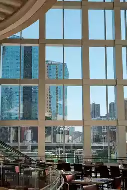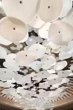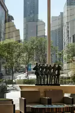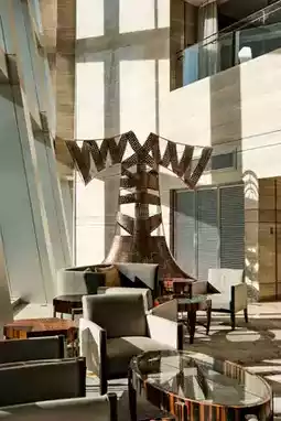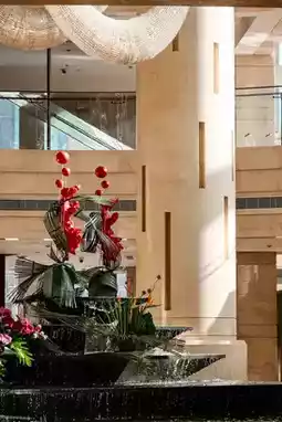 The lobby of Kempinski resembles an enchanted glass palace, with water cascading down stone steps like shimmering jade mist. The circular chandelier hanging from the dome falls like the Milky Way, creating a dialogue between elegance and fashion alongside the beige marble columns. Sunlight penetrates the floor-to-ceiling windows, casting flowing shadows between the light gray sofas and black sculptures, making the entire lobby shine like a work of art.