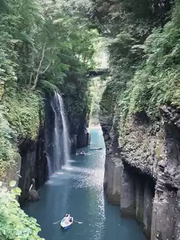 When visiting Kyushu, it's recommended to rent a car and drive to Takachiho for a day trip. Be sure to book a boat ride in advance. You can paddle close to the waterfall and take stunning photos, but keep in mind that the ride is limited to 30 minutes, so manage your time well and have some basic rowing skills. Afterward, visit Takachiho Shrine, then head to Amano Iwato Shrine and Kamishikimi Kumanoimasu Shrine. The atmosphere at these two shrines is completely different, so if you have time, make sure to explore them.