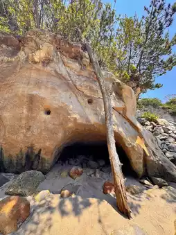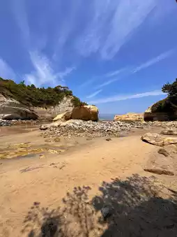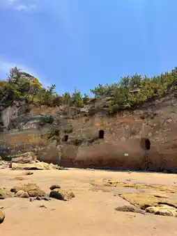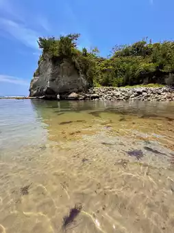 It's a very fun beach with white sand, steep sea cliffs, blue skies💙 and caves🫧You can even play on the rocks🦀
