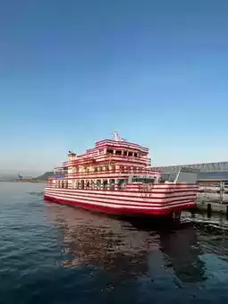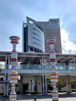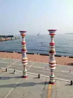 'Liminal Air -core-' features a white base with colorful spiral patterns and mirror decorations. The massive and towering pillars stand like guardians of the sea routes to the Seto Inland Sea islands. Nearby, you can also find 'Seed Ship' by Taiwanese artist Lin Shun-Long, both of which are part of the Setouchi Triennale.