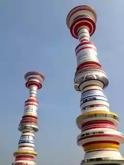 Upon arriving at the Takamatsu Port in Shikoku, you will notice two towering pillars by the harbor. These are the works of artist Shinji Ohmaki, titled 'Liminal Air -core-'. The two pillars, each eight meters tall, are said to represent the intertwining of a man and a woman, echoing the red and white ferries that travel to Megijima and Ogijima islands.