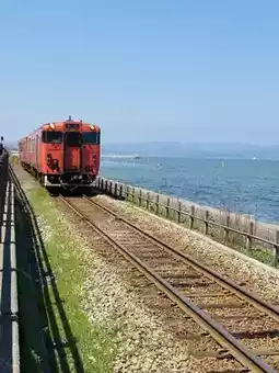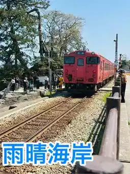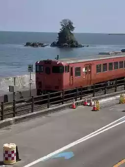 A train like the one in the world of Ghibli passes along the coast.